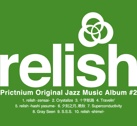 M3-2013秋 新譜 Prictnium オリジナルジャズアルバム「relish」のアルバム情報と全曲試聴データを更新しました!全10曲の全編オリジナル楽曲。Jazzを中心に据えつつ、ファンク、ドラムンベース、ブルース、ソウル、アコースティック、ミュージカル風楽曲など多彩なジャンルに挑みました。